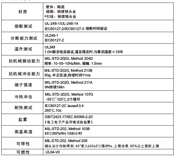 預(yù)期飛弧/熔斷時(shí)間,電流特性:當(dāng)保險(xiǎn)絲通以下述規(guī)定電流時(shí),熔斷時(shí)間必須符合表格要求,熔斷后管體不應(yīng)破裂,端蓋不應(yīng)脫落。